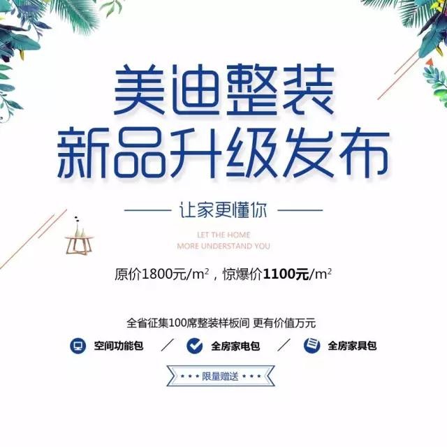能不能有一款家裝產品,從多個維度滿足消費者的需求?美迪裝飾給出了一份答案。美迪整裝自上市以來,受到了市民的喜愛和追捧,目前,這款美迪整裝在原來“配置”的基礎上,進行了全面升級,增加十大空間功能,升級后的產品,市場價1800元每平米,上市期間直降700元,1100元每平米。