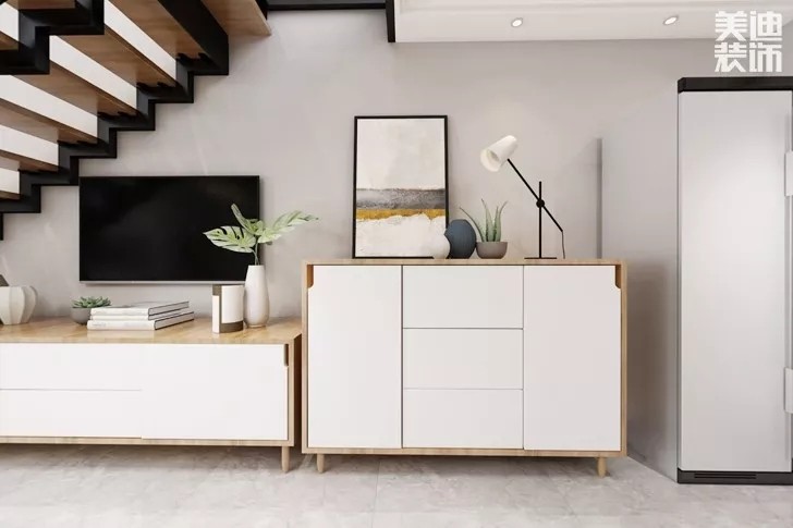 把電視柜做為一個裝飾柜,或者一個展示柜來使用,在增強客廳美觀程度的同時,將客廳的收容性質做到更大。