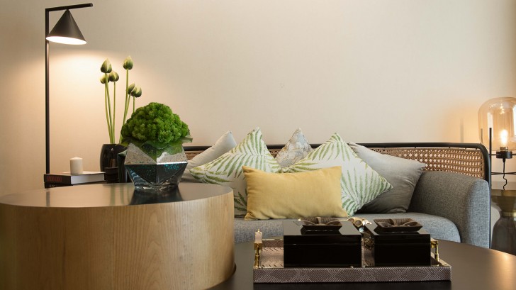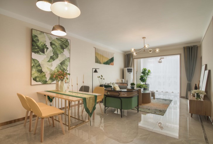 客廳利用淺色地磚和白色天花板作為背景色,而墻面、電視墻和沙發(fā)家具則利用各種綠色和嫩黃色作為主色調(diào),渲染一副清新的美好畫(huà)面。