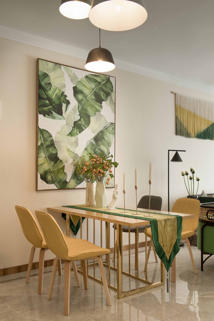 餐廳餐桌椅以深木色木質(zhì)餐桌和淺綠色皮質(zhì)餐椅組成,餐廳背景墻作淺綠色硬包設(shè)計(jì),掛和那個(gè)一組美式風(fēng)情裝飾畫(huà),加上桌面和地面的花朵綠植,格外讓人陶醉。