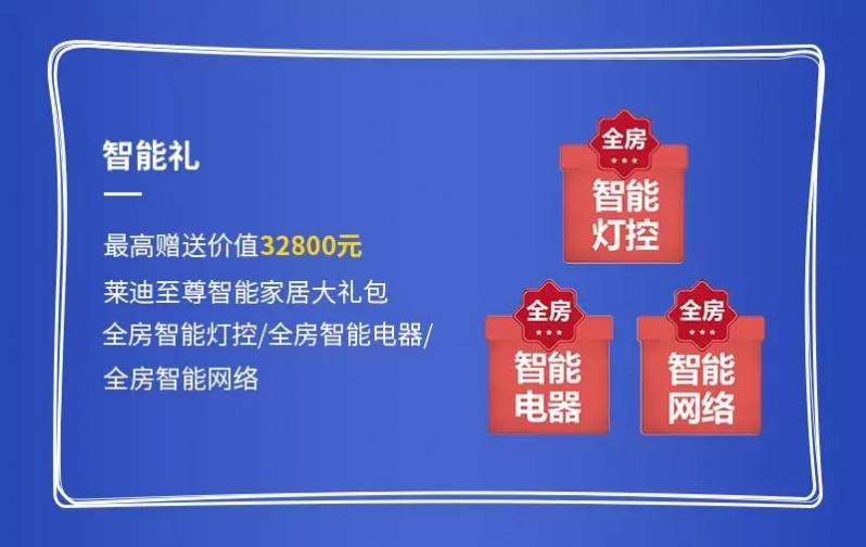 全房全景智能家裝年中大促,體驗未來家,省心更省錢,全房智能家裝一次配齊,贈送價值32800元智能家居大禮(智能家居大禮包三選一)。