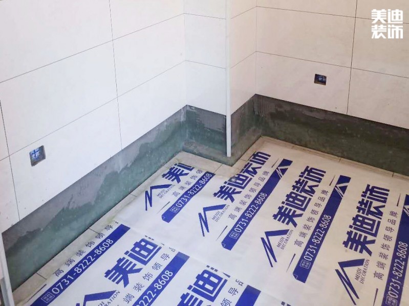 地面瓷磚保護膜鋪貼,鋪貼完成后木工進場,防止后期施工過程中因為材料運輸等意外引起的地面刮擦損傷瓷磚。