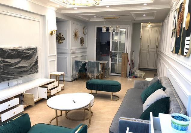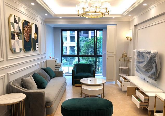 整體裝修風(fēng)格是輕奢風(fēng),從家具上應(yīng)該可以看出來??蛷d和陽臺(tái)是連著的,沒有做移門這樣空間會(huì)顯的大一些。陽臺(tái)做了一個(gè)儲(chǔ)物柜,用來收納。沙發(fā)和電視墻都是以石膏線為主做了簡單造型當(dāng)做背景墻了。