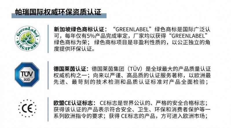 帕瑞涂料在VOC含量相關檢測中VOC含量趨0,重金屬物質檢測中無汞、鉛等物質,符合國內外各類檢驗標準,并取得國際多項權威資質認證。