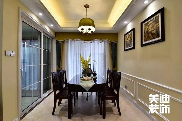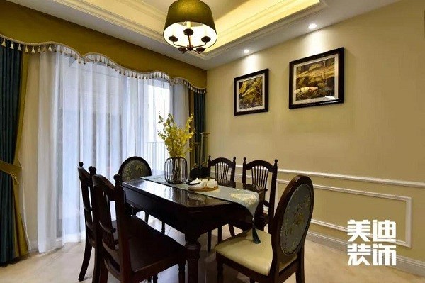 餐廳與客廳在同一個空間沒有被隔開,加深了空間的流通感,顯得空間更加寬敞明亮。符合美式風格自由又隨意的特點。