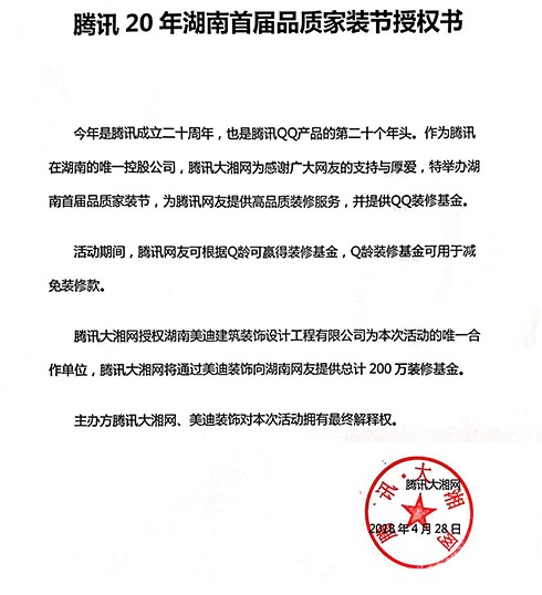 經過騰訊湖南的嚴格篩選和大量樣本的用戶調查,美迪裝飾從數十家湖南家裝企業中脫穎而出,成為本次活動唯一指定合作單位。騰訊大湘網將通過美迪裝飾向湖南網友提供總計200萬裝修基金。