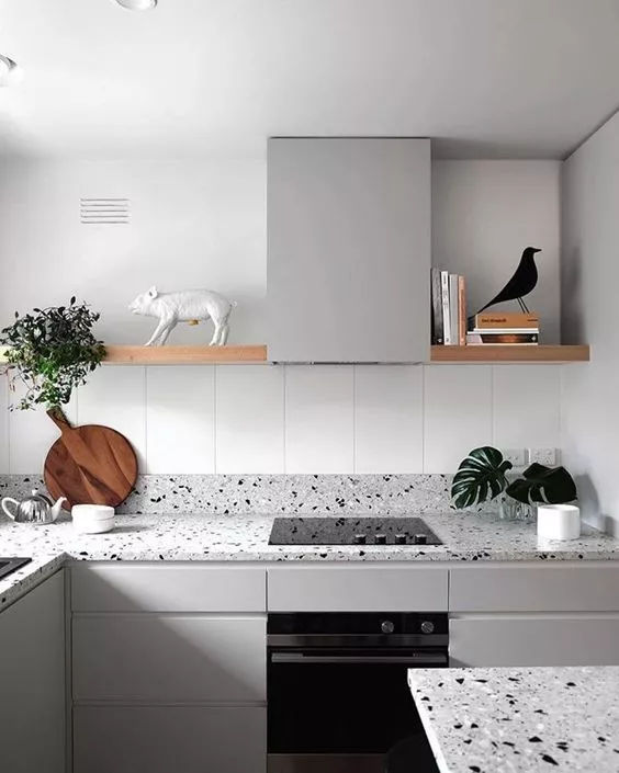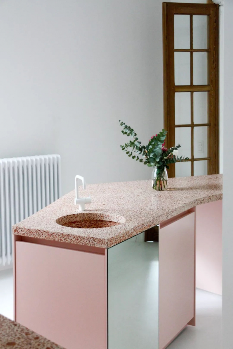 作為一種人造石,水磨石就是將不同色彩和不同大小的碎石、玻璃、大理石、石英石、花崗石等拌入水泥粘接料制成混凝制品后,再經(jīng)表面研磨 、拋光的制品。這個(gè)曾被看作低廉、守舊的材料,近兩年又以各種形式不斷出現(xiàn),其隨意不規(guī)律的花紋和樣式,賦予創(chuàng)作更多的想象和可能。