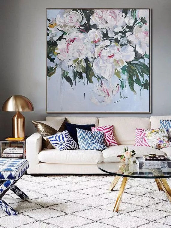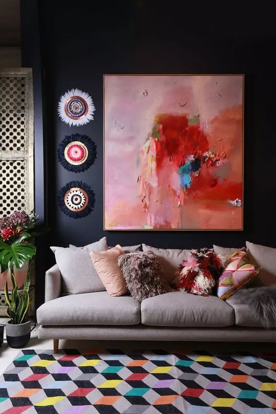 很長一段時(shí)間,裝飾畫流行一種用多幅畫組合裝飾墻面的掛法,或是把中心點(diǎn)集中在同一條線上,把相同尺寸和形狀的裝飾畫進(jìn)行排列,但 2018 年的新趨勢(shì)是用單幅大尺寸的畫裝飾墻面,不管是海報(bào)、繪畫作品還是攝影作品。