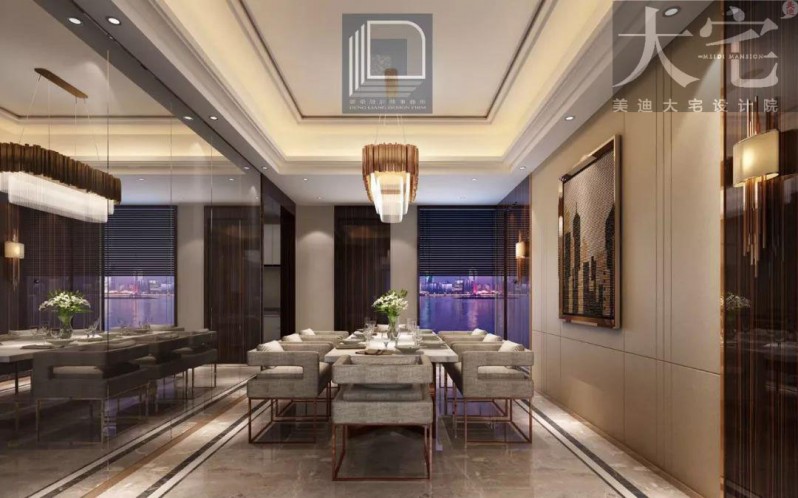 餐廳的設計獨具一格,沉穩色調的大理石與玫瑰金色系的燈飾襯托得恰到好處。一眼能望到湘江夜景的玻璃墻,實用性與美觀兼具的餐桌搭配,人間有味是清歡,舉杯提箸間的感情交流,舌尖上的一飲一啄,才是人間至味。