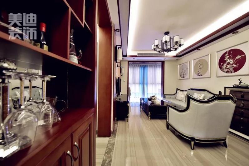 這是一張進門照,入戶和酒柜也都是廖女士很滿意的地方,經典色系的酒柜與整體的新中式風格映襯得剛剛好。