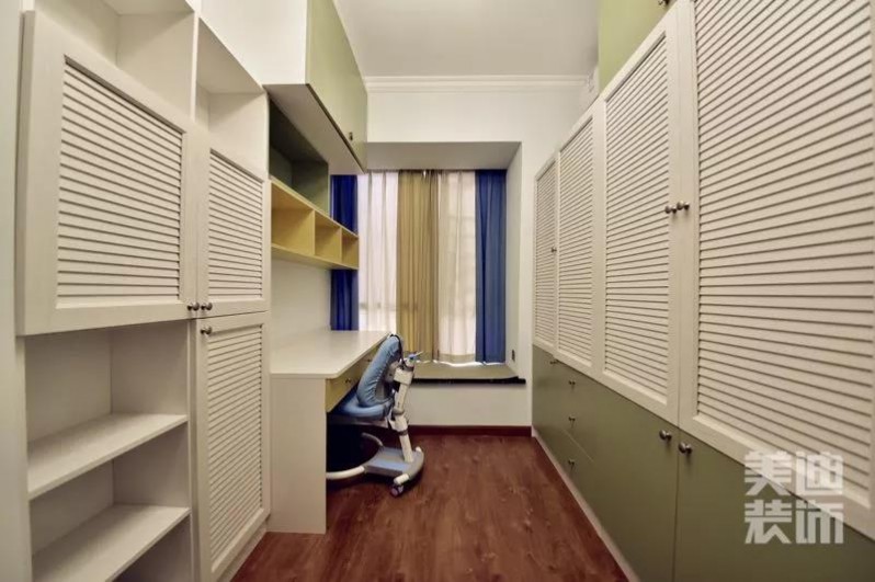 這是專門為豆豆設計的書房,色系也是選擇讓人舒服的暖色調。米色書柜與淡藍色窗簾結合,動靜結合,不失靈動。