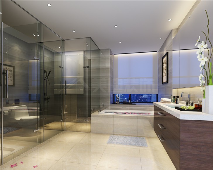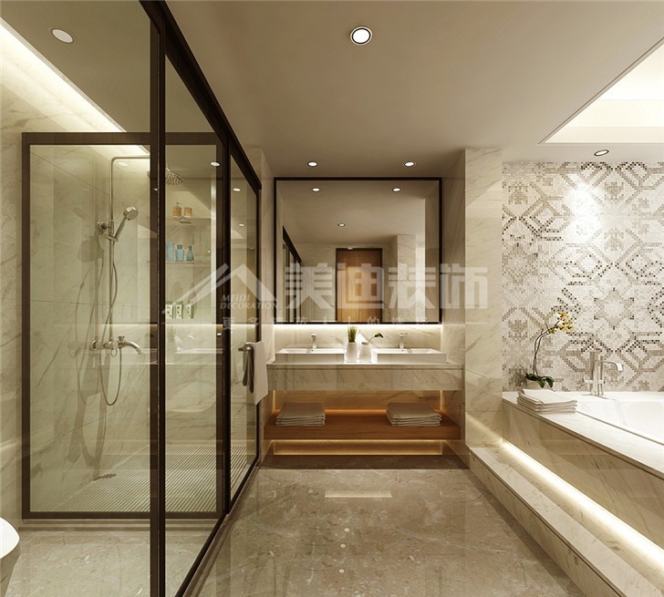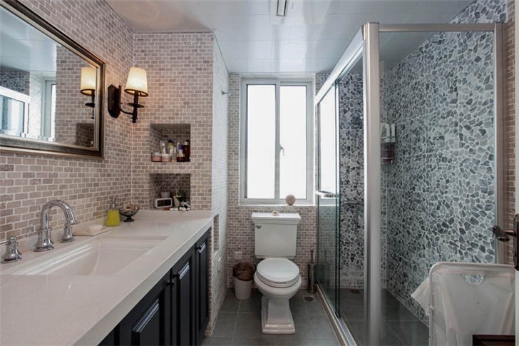 墻面是占據(jù)整個(gè)空間大部分面積,而整體色彩會(huì)給人先入為主的既視感,因此,提升的關(guān)鍵要從墻面開(kāi)始,在顏色上,宜選用清冷淡雅色調(diào),除給人以干凈清爽之感外,也會(huì)增加空間感,如不規(guī)則條紋大理石,讓整個(gè)衛(wèi)生間充滿(mǎn)隨性,輕松