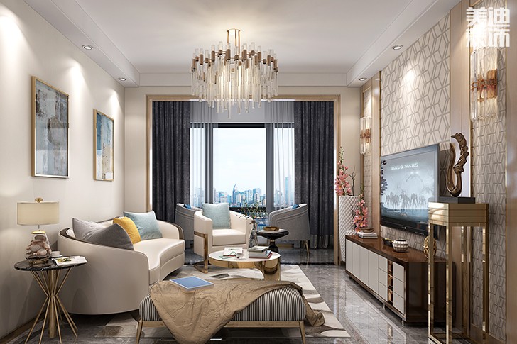 新華聯(lián)夢(mèng)想城109平港式輕奢風(fēng)裝修案例效果圖--客廳