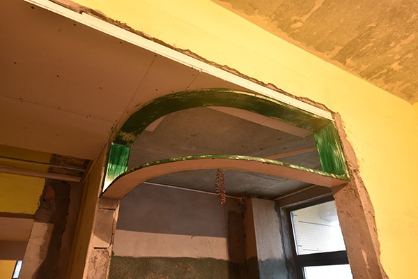 吊頂采用輕鋼龍骨材質骨架、石膏板與石膏板接口采用V型槽、石膏板轉角采用“七字角”有效防止開裂并鋪設大芯板將吊頂墻體拉直處理。