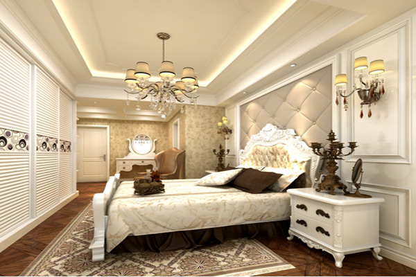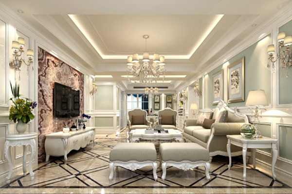 選材方面,除了歐式慣用的白色實木材質外,還使用了藝術壁紙、皮質軟包、水刀大理石拼花等現代材料,大大提升了原質感的對比效果,在表現尊貴的同
