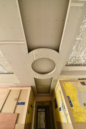 細節:過道異性吊頂。七字行,就是像阿拉伯數字7一樣,橫豎有連筆成一體的樣式。七字行吊頂,就是在吊頂拐角處的兩個角,用一整張板材做成,這種結構可以最大程度保證吊頂結構穩固,其表面的裝飾材料不易開裂,鼓起,脫落。